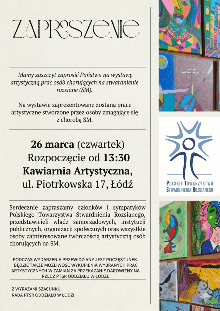 Serdecznie zapraszamy członków i sympatyków Polskiego Towarzystwa Stwardnienia Rozsianego, przedstawicieli władz samorządowych, instytucji publicznych, organizacji społecznych oraz wszystkie osoby zainteresowane twórczością artystyczną osób chorujących na SM.